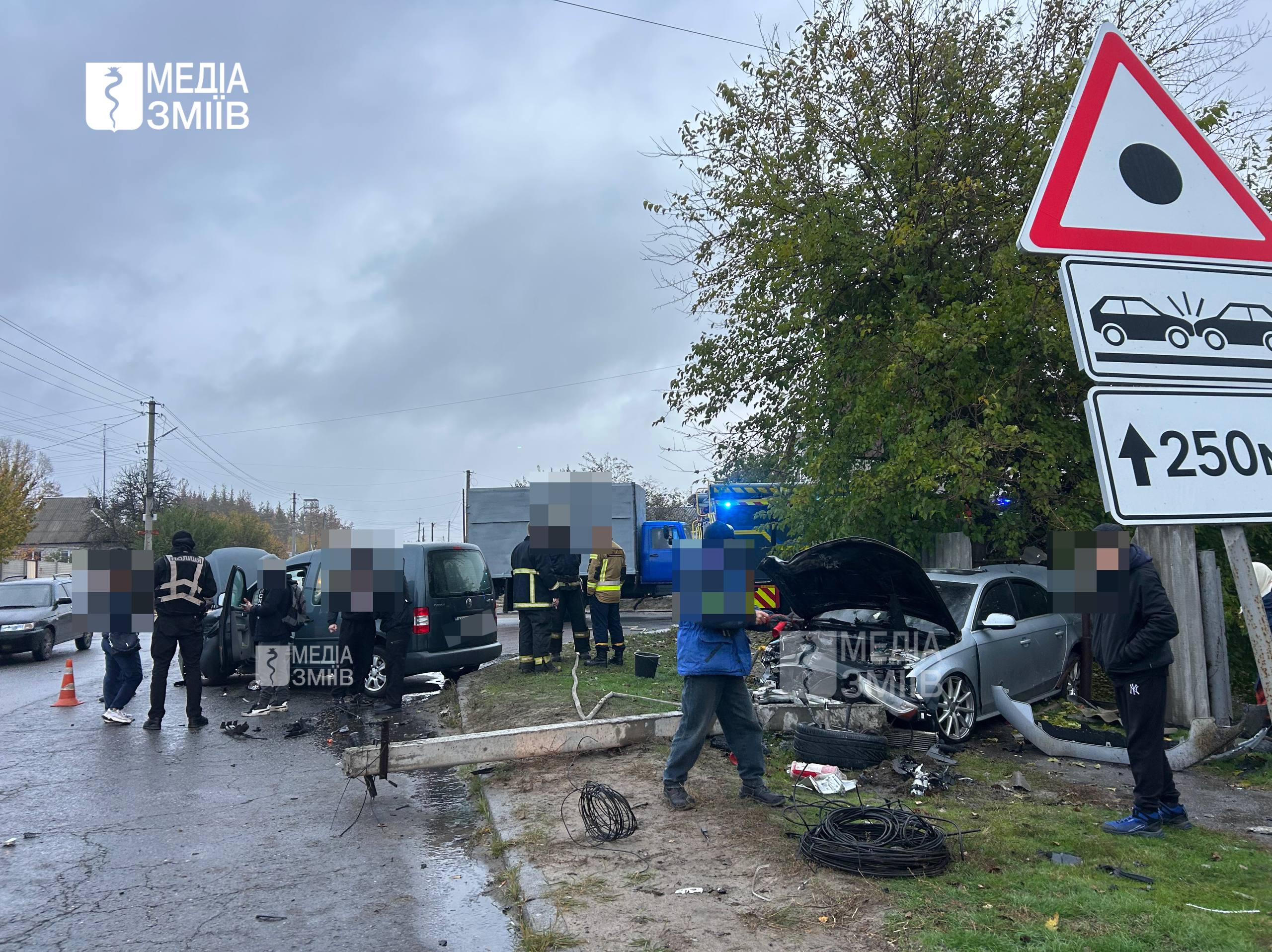 У Змієві зіткнулися дві автівки: знесено електроопору та пошкоджено паркан — фото з місця