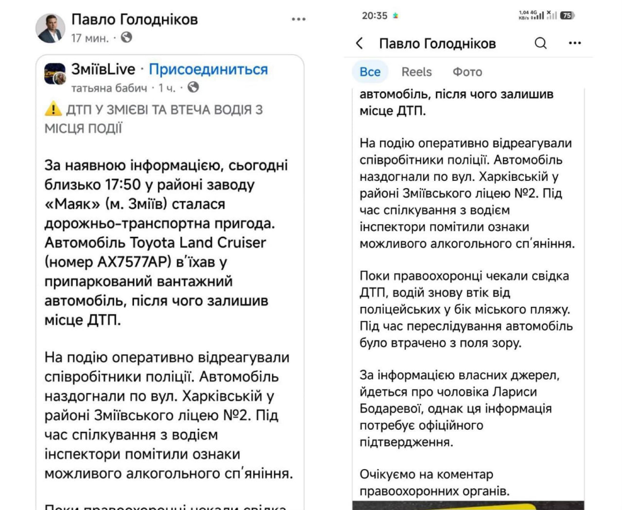 Щойно на офіційній сторінці Зміївського міського голови Павла Голоднікова було оприлюднено повідомлення про нібито ДТП у місті Зміїв, у якому безпідставно згадується моя родина та оприлюднено номер автомобіля.