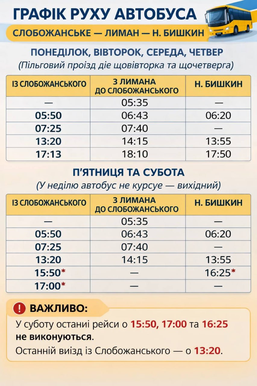 ️ УВАГА ! ЗМІНА РОЗКЛАДУ! З 5 березня 2026 року на маршруті Слобожанське — Лиман — Н. Бишкин введено в дію оновлений графік руху
