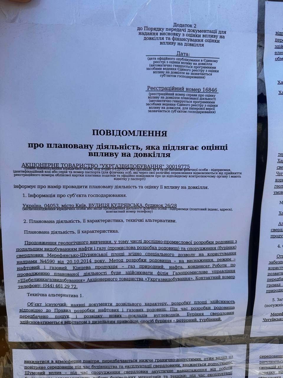 На зупинках громадського транспорту у Змієві мешканці помітили оголошення про плановану діяльність, пов’язану з видобутком газу.