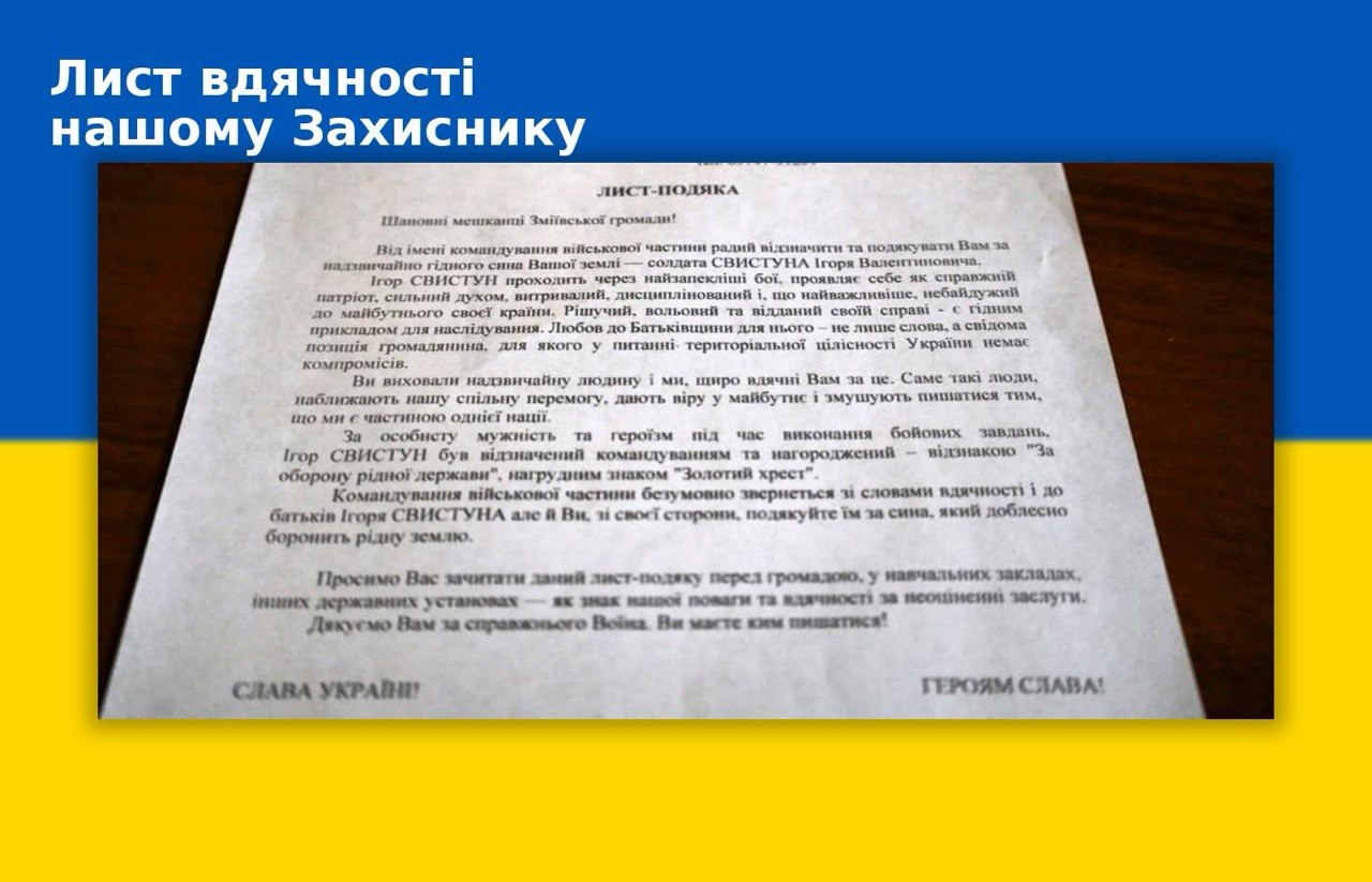 До Зміївської громади надійшов особливий лист — лист вдячності від командування військової частини.