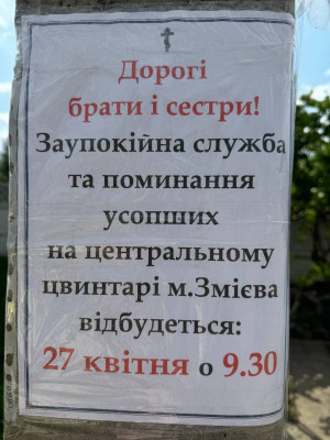 Заупокійна служба у Змієві 27 квітня о 9:30 на центральному цвинтарі м. Змієва відбудеться заупокійна служба та поминання усопших.