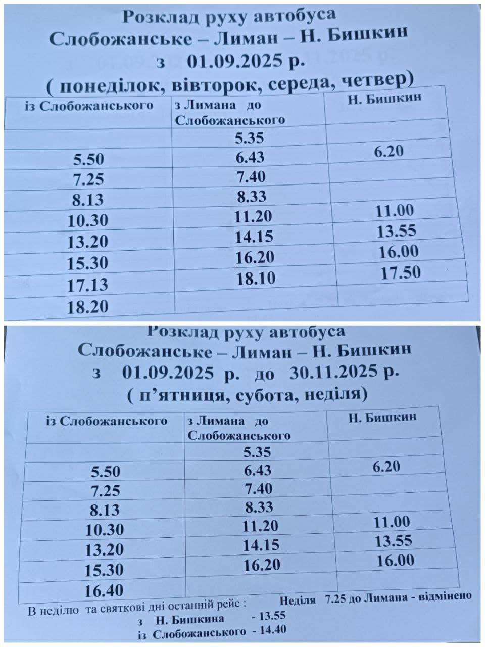 УВАГА! Змінився розклад автобуса Слобожанське – Лиман – Нижній Бишкин