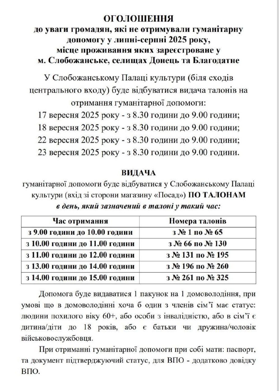 Жителі, які не отримували гуманітарну допомогу у липні–серпні 2025 року, зможуть отримати талони на видачу продуктів.