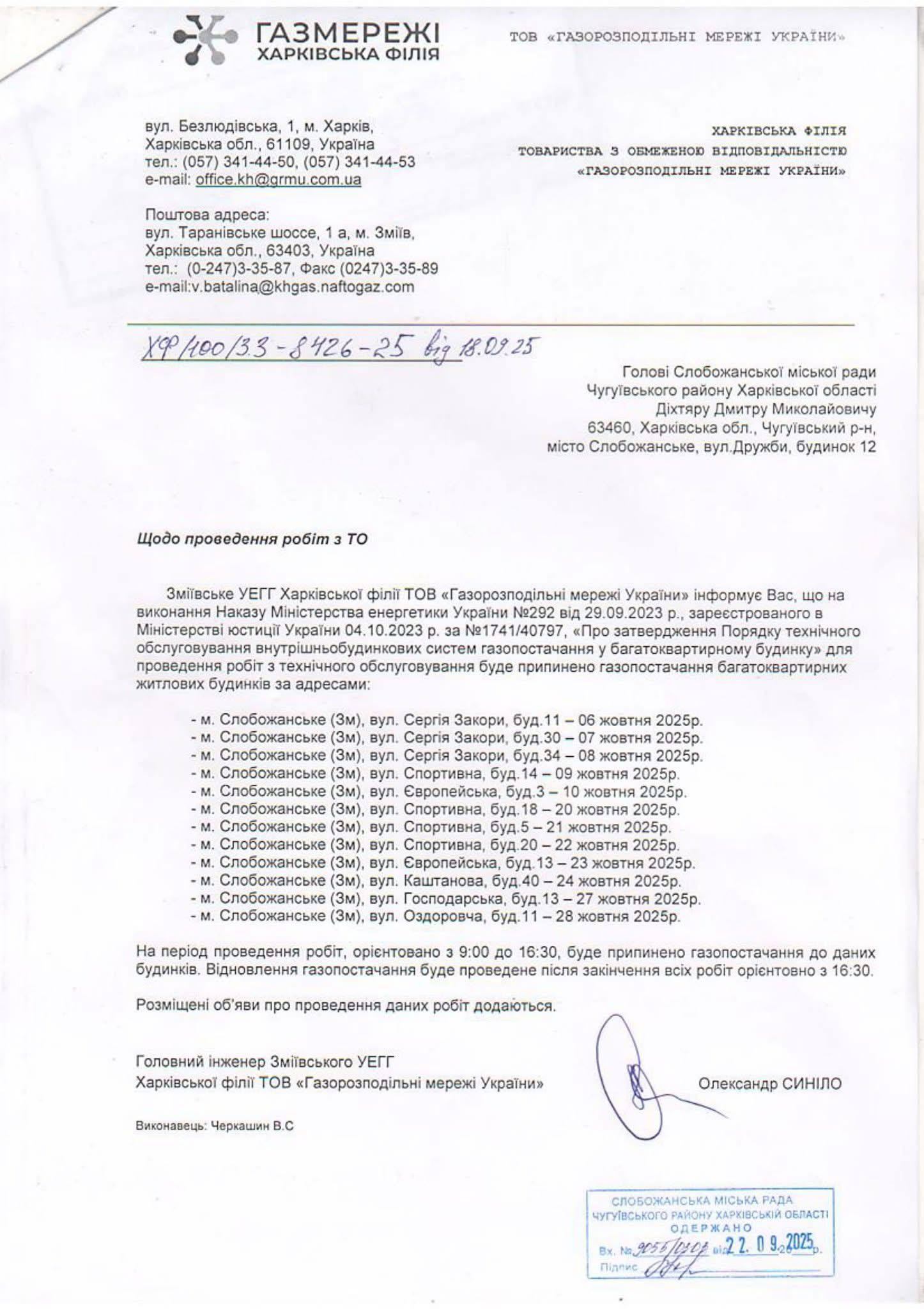 Протягом жовтня 2025 року спеціалісти Харківської філії «Газмережі» виконають технічне обслуговування газопроводів спільної власності у 12 багатоквартирних будинках міста Слобожанського.