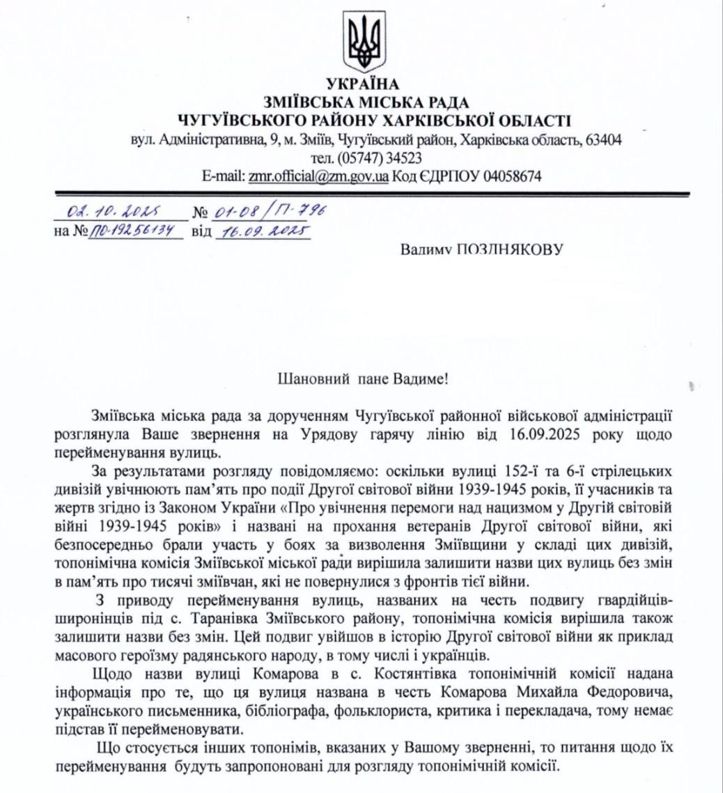 Щодо інших назв, які були згадані у зверненні, — питання їхнього можливого перейменування буде додатково розглядатися топонімічною комісією.