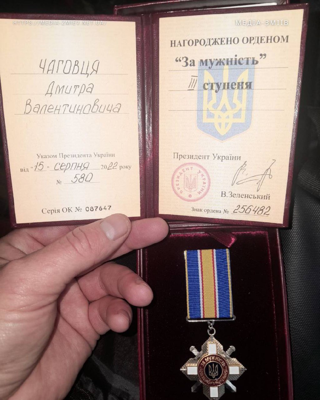 Сьогодні, 6 грудня, у Харкові, з нагоди Дня Збройних сил України, 32-річному Дмитрові Чаговцю урочисто вручили орден «За мужність» III ступеня, виданий Указом Президента. Це його перша велика державна нагорода — за героїзм у бою в березні 2022 року.