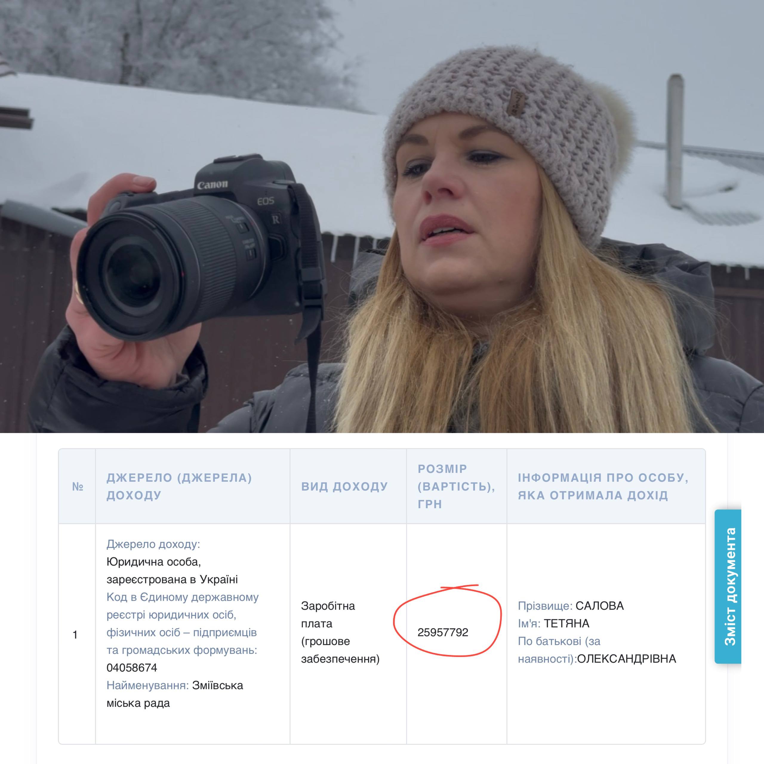 Салова Тетяна Олександрівна, прес-секретар Зміївської міської ради, головний спеціаліст сектору з висвітлення діяльності міської ради, у декларації за 2024 рік зазначила дохід від заробітної плати у розмірі 25 млн 957 тис 792 гривні. У перерахунку це становить понад 2 мільйони 160 тисяч гривень на місяць.