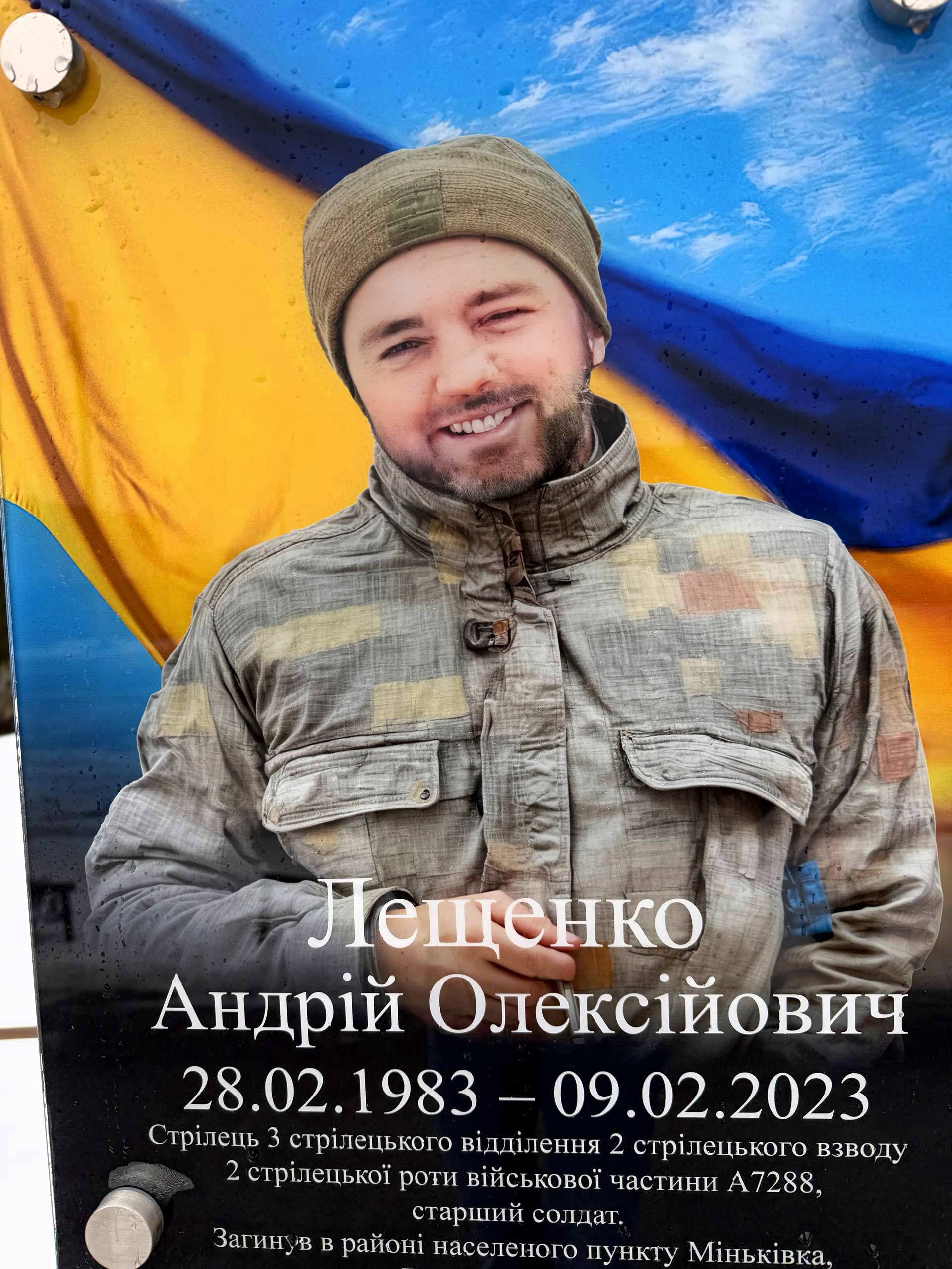 Життя старшого солдата Лещенко Андрія обірвалося під час виконання бойового завдання в населеному пункті Міньківка Донецької області 9 лютого 2023 року.